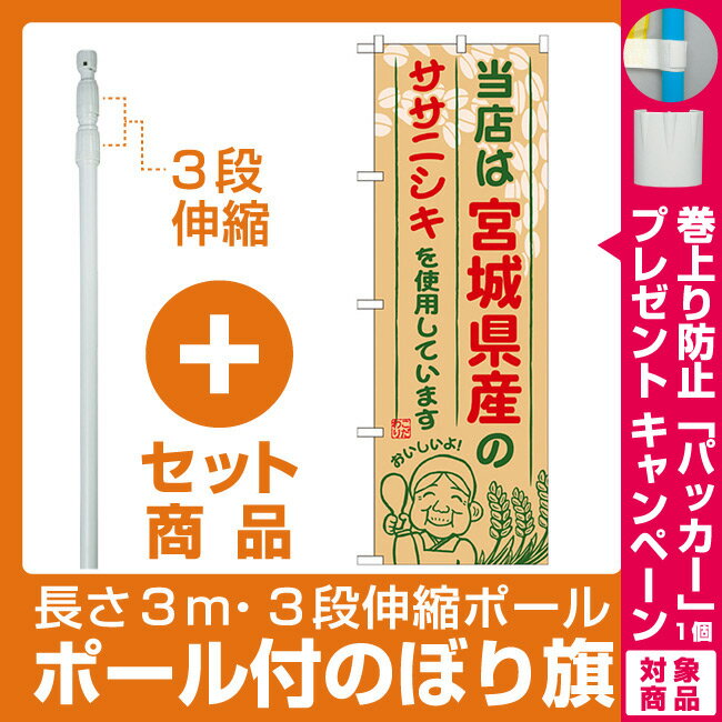 【プレゼント付】【セット商品】3m・3段伸縮のぼりポール(竿)付 ご当地のぼり旗 宮城県産 内容:ササニシキ (SNB-886)