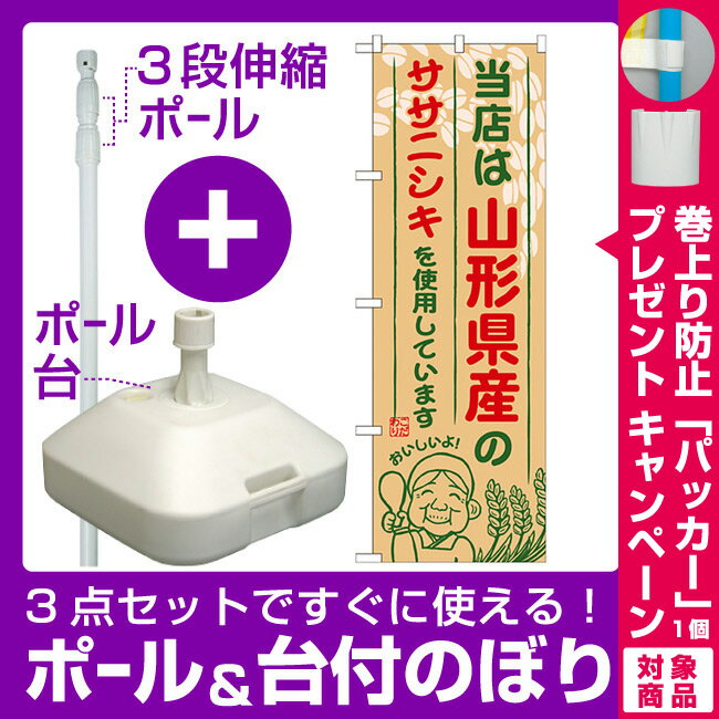 【プレゼント付】【3点セット】のぼりポール(竿)と立て台(16L)付ですぐに使えるご当地のぼり旗 山形県産 内容:ササニシキ (SNB-891)