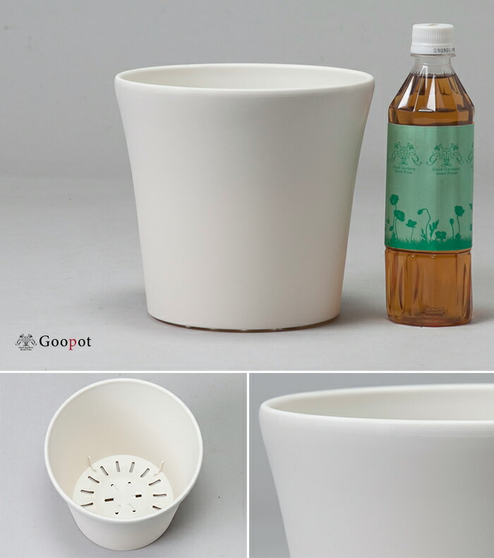 直径19cm 高さ17.5cm 口径17.5cm 底直径14cm 内高さ16cm 内底直径14cm 重さ : 約 0.22kg 容量 : 約 2.5リットル 色 : ホワイト 素材 : ポリプロピレン 底穴 : 有 受皿(同素材)は別売です モダンインテリアにぴったりのシンプルでナチュラルなデザイン 陶器のように肉厚でしっとりとした質感が特徴です 傷が付きにくく、水で拭き取れば汚れが落ちやすい加工です ★